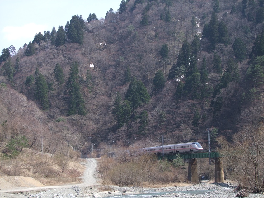 さて、桜と武家屋敷で有名な角館駅で降り、次の鶯野駅まで歩いてみましょう。この区間には鉄道橋としては珍しい、2連続エクストラドーズドPC橋という、比較的新しい種類の橋梁が存在します(左下写真参照)。そこを走るE6系『スーパーこまち』号…。何とも絵になるではありませんか(笑)。