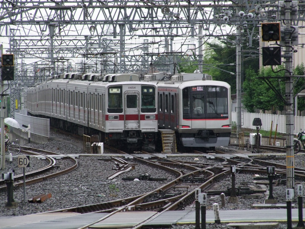 さて、成増駅留置線を写した上のが挙げたところで、東上線車両についても徐々に説明しておきましょう。左上写真には同じ種類の車両が2本見えますが、これは9000系という車両で、東京メトロ有楽町線直通用として開発された車両です。そして時代は過ぎ、副都心線対応が必要になってきますが、ここで試作車の1編成を除いて、そのリニューアルが施されました。その対応型が左の車両で、真ん中に走っている車両こそ、1編成のみの試作車なのです。何故試作車には対応が施されなかったかというと、製造が6年も異なる事(試作車が1981年、量産車は1987年)と、それに伴う寸法の違い(副都心線にはホームドアが設置されていて、ドア間の寸法が試作車では異なります)や、走行装置の違い等が大きな理由かと思われます。故に、試作車は現在は地下鉄には乗り入れておらず、地上線専用の運用となっています(量産車は主に地下鉄に乗り入れますが、運用によっては地上線に入る事もあり、左上写真のような共演も見られるのです)。