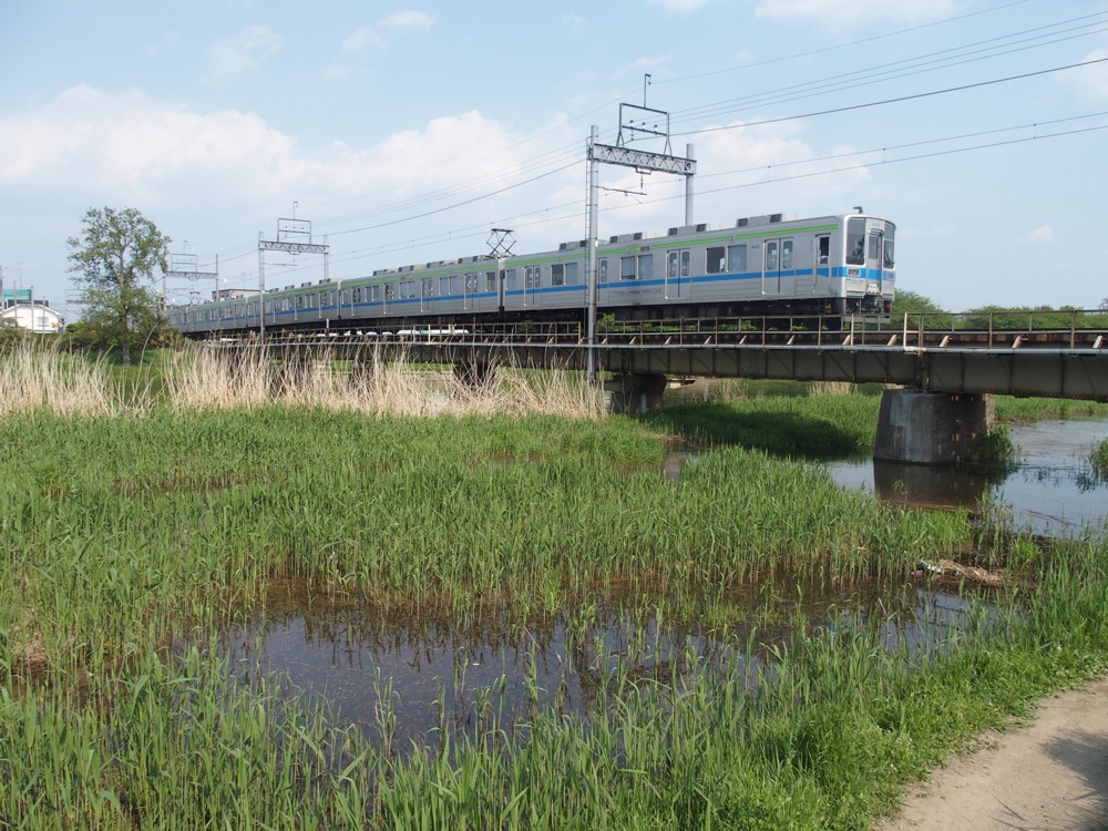 坂戸駅では越生線を左に見ながら(左上写真参照)、一気に右カーブします。そのまま北坂戸駅を過ぎ、越辺川を超え、都幾川を超え、沿線は徐々に緑が多くなってきて長閑な風景になってきますが、やはり駅に近付くと、ある程度の宅地化が行われているのが、東上線の凄いところでしょう。この為、快速や急行列車は、東松山駅を過ぎて、やっと空いてきた…という感じになります。流石は通勤・通学路線です。