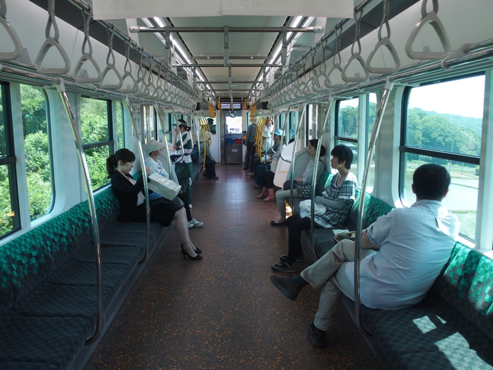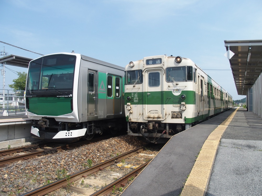 …暫くして、遠くから電車風の車両がやってきましたが、パンタグラフは畳んでありますし、何よりここは非電化区間であるというのが、見た目的に不思議な感じを醸し出しています。今まで乗ってきたキハ40形のようなエンジン音はせず、時折モーターの音が聞こえるので、やはり電車という括りになるのでしょうが、これが蓄電池駆動電車の特徴という事なのでしょう。車内は最近のJR東日本の車両という感じで、両開き、3扉車である事から、都心を走っていても差し支え無さそうな雰囲気でした。また、車内灯は LED 化されており、正に最新鋭の技術を持って生まれた車両であるとも言えるでしょう。また、駅を発車する時に発車メロディが流れてきたのですが、これは車両側に設置されているもので、成程、無人駅等を走るローカル線ならではの対策がされている車両なのだとも思いました。