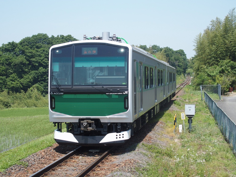非電化路線なのに電車が導入…というのは不思議な話しですが、簡単に言うと、パンタグラフを持つも、車体にリチウムイオン電池を搭載し、架線の無い区間でも走れるようにした電車なのです。愛称は、蓄電池を表す英語の Accumulator から“ACCUM”(アキュム)と名付けられており、早速地元では、烏山線で初の電車!…という事で、大きな歓迎がされています。確かに、この車両に対する期待は大きく、今のところ搭載されている蓄電池の容量が烏山線に適していた事から(宝積寺駅〜宇都宮駅間で、電化されているJR東北本線に乗り入れているというのも、適合の理由に値するでしょう)、まずは烏山線への導入に至ったようですが、色々と応用する事によって、他線への導入も考えられる事でしょう。ディーゼルカーよりも環境に優しいのは確かですし、近代化も一気に進展していきそうです。