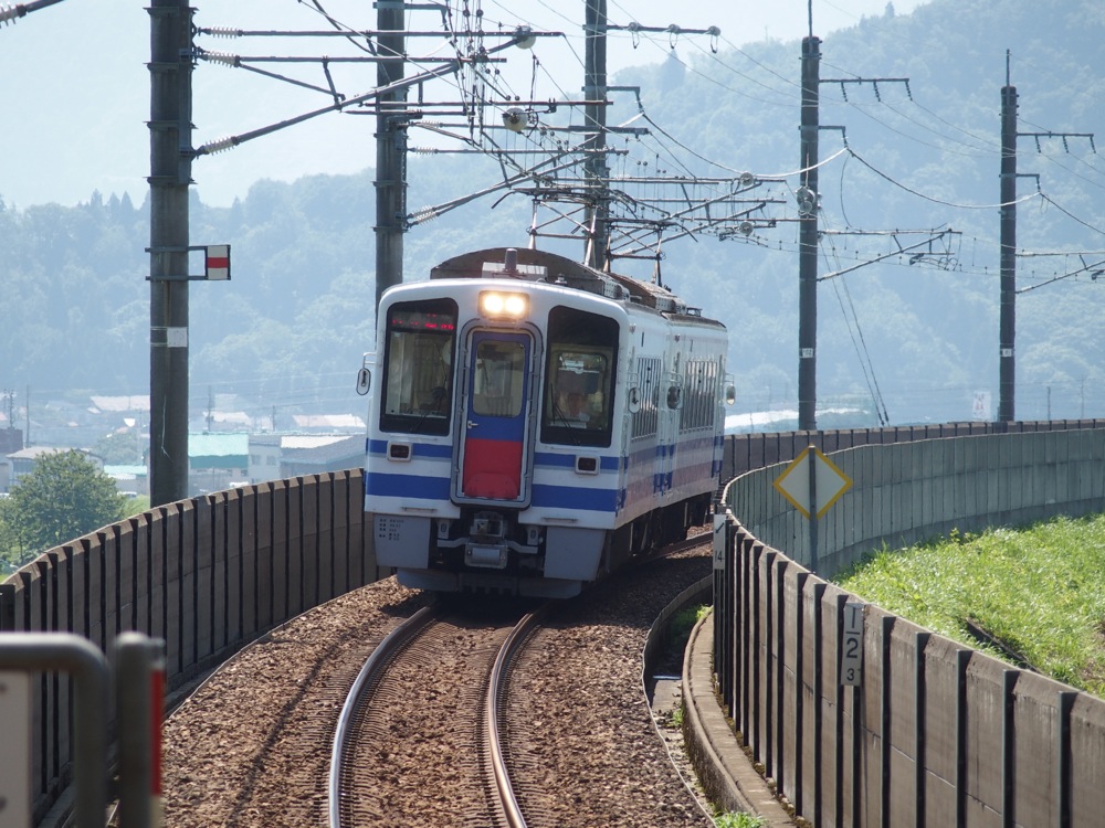 これらは、実際に蓋を開けてみないと分からない部分もありますが、色々な対策が考えられているのは事実でしょう。…という事で、『はくたか』号の現在のような活躍も、北陸新幹線の開通である2015年の春までかもしれなく、もう残された時間は僅かしか無いという事になりました。自分は、この路線は特急『はくたか』号でしか通過した事が無く、沿線の風景も知らない部分が多かったので、今回の“鉄道さんぽ”のタイミング的には、正に今しか無い路線だと言える事が出来ましょう…。冬の時期に取り上げても良かったのですが、降雪量の多いこの地域的に、問題無く“さんぽ”が出来るかどうかも疑わしかったので(笑)、8月の現在の時期とさせて頂きました。ほくほく線というと、やはり雪のイメージもありましたが、今回の時期に“さんぽ”をして大正解。夏ならではの風景をバックに走る、ほくほく線の絵画的な姿を見る事が出来ました。勿論、その分暑さは尋常ではなく(笑)、体力的にも大変だった状況でもありましたが、とても良い印象を残す事が出来たと思いました。それではどうぞ御覧下さい!