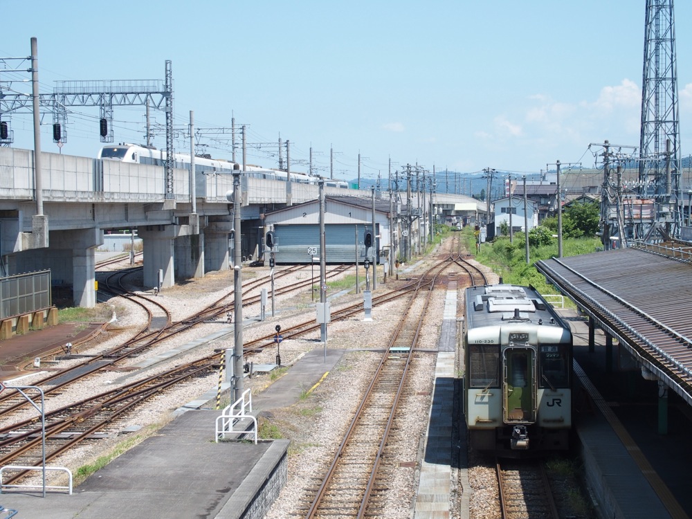 そして、住宅や工場が多くなってくると直江津駅に到着します。上越市の交通の要衝とも言える場所で、JR東日本とJR西日本の境界駅でもあり、管轄はJR東日本ですが、当駅を終点とするJR北陸本線の普通列車等、JR西日本の車両が多く見られます。
