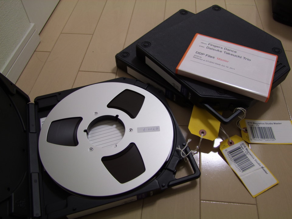 さて、今回の録音は何度も言っているように、パソコン等のデジタル機器を使わず、テープで録らせて頂きました。…とは言え、実際にはCDで聴くので、結局はパソコンを通す事になるのですが、それでも、テープで録った時のあの柔らかい感じが表現出来ていて、非常に自分好みで心地良い音楽の空間が再現されています。そのマスター・テープは自分にも戴けて、合計で3本(1本、30分弱しか録音出来ないのです)のテープが自宅にあるのですが、右上写真にあるように、なかなか大きな代物です(その右上に写っているオレンジ色のケースが、一般的なDVDのケースの大きさです)。正に、形ある物が残せた…という印象がありますね。