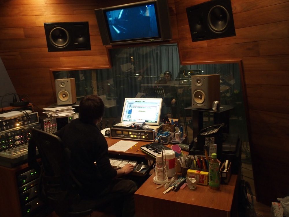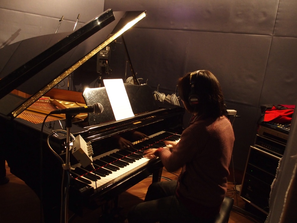 録音は至って順調に進められました。自分が遅れて1:00に着くまで、丸本さんはクリックを聞きながら練習をたっぷり出来たそうで、これがまたスムーズなレコーディングの流れに繋げる事が出来ました。…というのは、自分がスタジオに着いた時点で、丸本さんが担当する部分の録音は終えていて、それに自分のピアノを重ねるという作業から始められたからです。