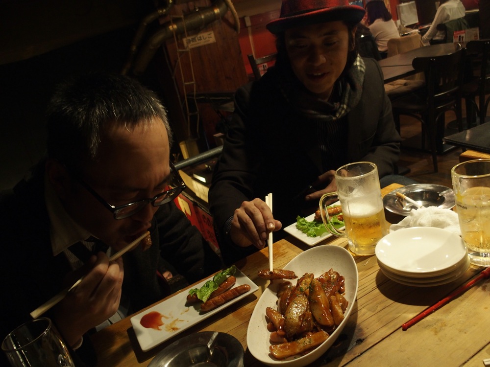 この後は、メンバー4人で久し振りに飲みに行ったりしていたのですが、やはり話題の中心は自分達のバンド活動の事ばかり…。良い話しも変な話しも(笑)、全てがバンドの財産であり、大いに笑わせて頂きました。1軒目は大学時代によく行った 300B(通称“サンビー”)。懐かしの BFFT(左上写真参照…恐らく、ベーコン・フランクフルト・フライドポテト・トマトソースなのだと思いますが…笑)を摘みつつ、2軒目は学校近くの居酒屋へ。そして3軒目には、どちらかというと高校時代によく行っていた餃子楼(右上写真参照)へ。とにかく学生生活の思い出の場所を梯子していった感じでした。