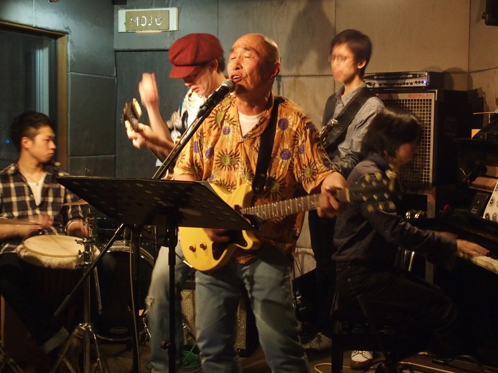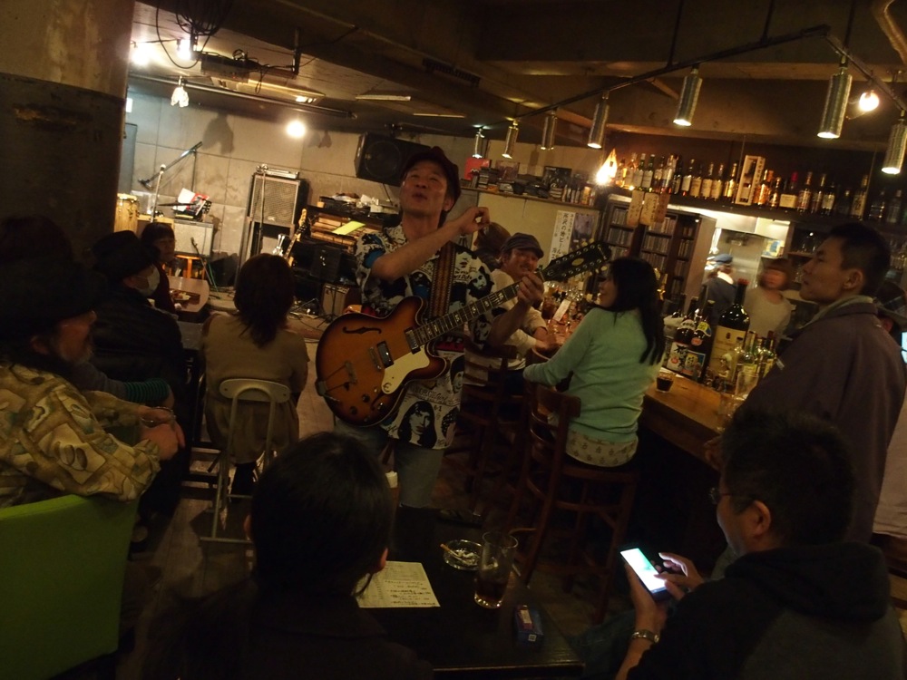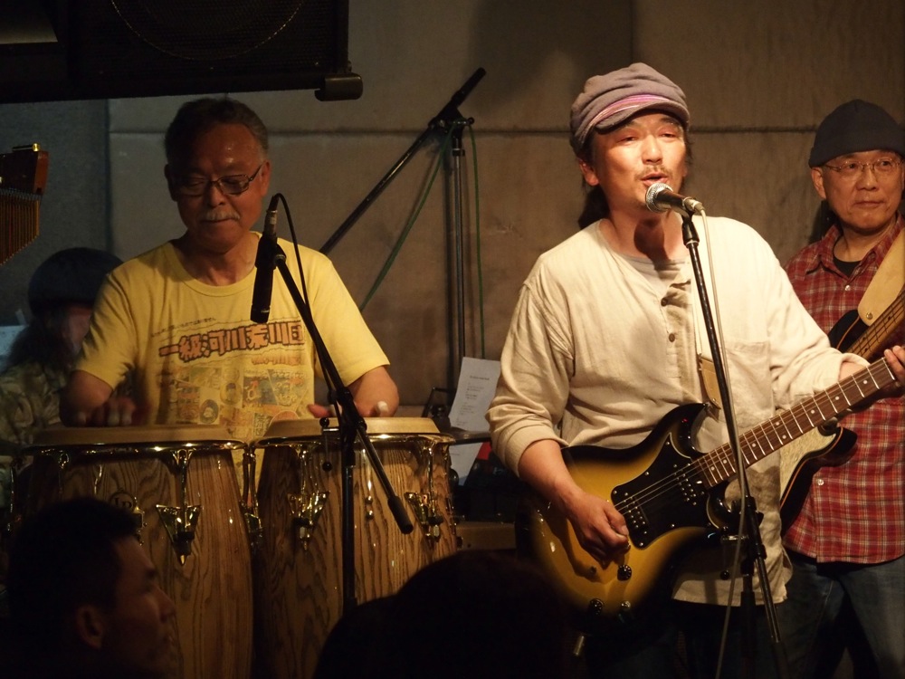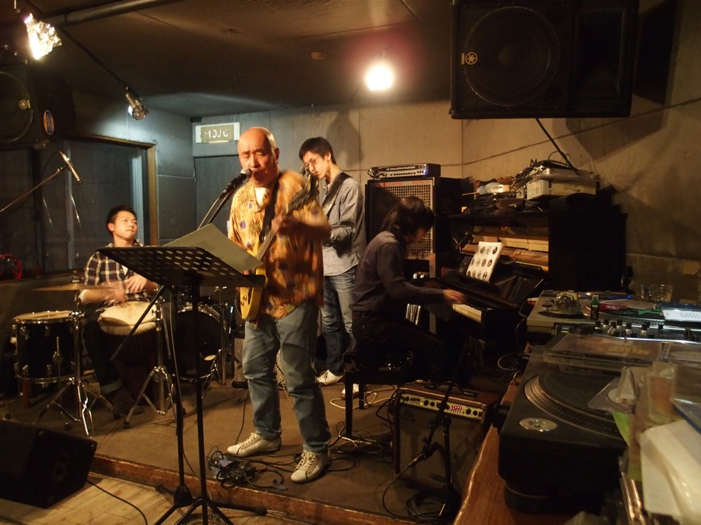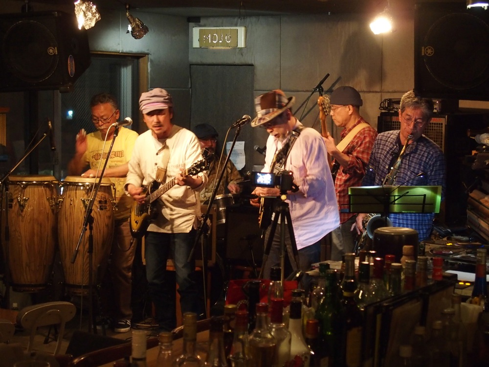 続いて、一級河川荒川団(下写真参照)の登場で、更に店内の熱量は上がっていきます。ノリの良い曲も多く、確かな腕に裏打ちされたそのステージは、文句無しに楽しさ溢れる時間へと繋がっていきました。そして、皆がステージの最後に発せられる言葉は、「伊藤さん、復活おめでとうございます」、「健康に気を付けて下さい!」…等々、それは温かなメッセージが込められたステージでもあったのでした。