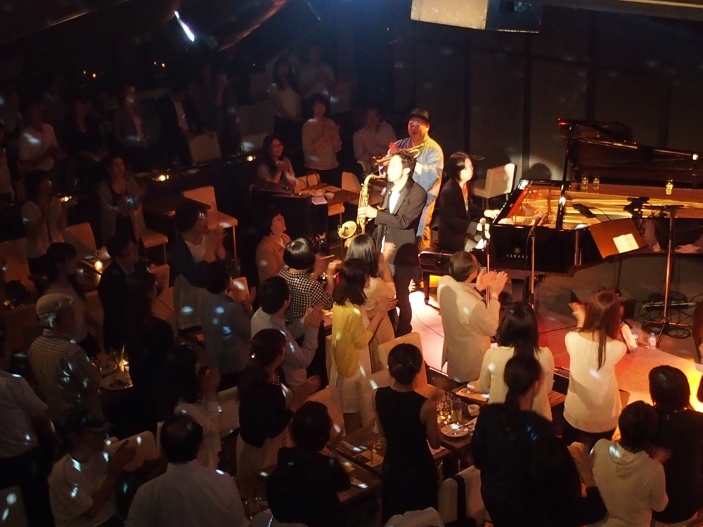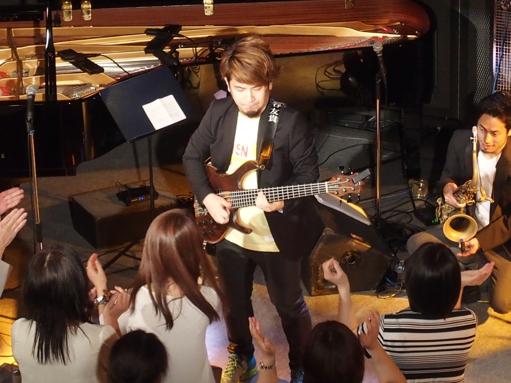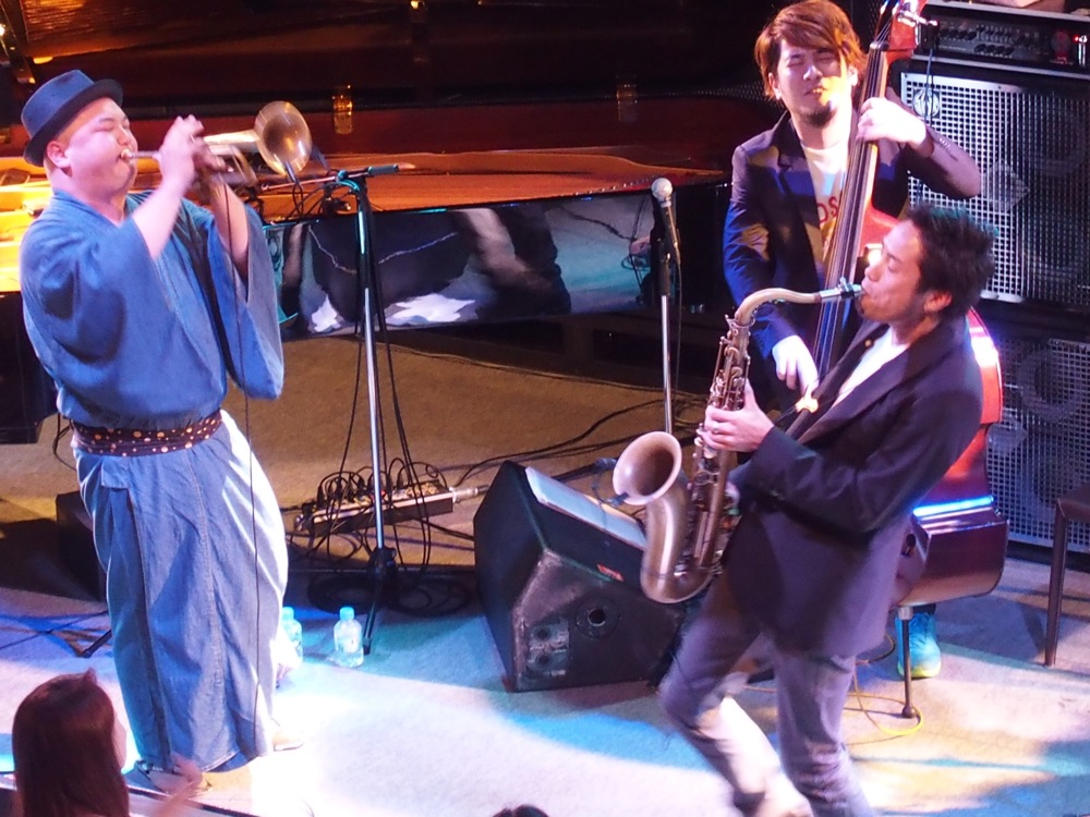 織田君がデュオ編成なら、サックスの藤田君も負けじと?デュオ編成で披露します。こちらはお馴染みの“Circle”で、今回のツアーで大阪、名古屋とも取り上げてきた曲でもあります。…そしてバラードでしっとりと聴かせた後には、お客さんを立たせて、いつものように演奏しながら客席に乱入していく藤田君の姿が…(笑)。この色々な側面が、TRI4TH というバンド自体の魅力にも繋がっていっているような気がします。