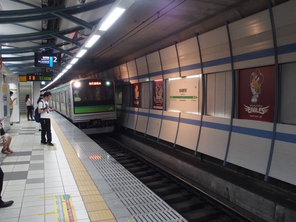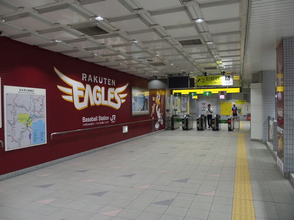 仙台駅を出て、暫くは地下鉄のような雰囲気?で路線が展開されていきます。どの駅も似たような雰囲気になりそうな感じですが、途中の宮城野原駅では、東北楽天ゴールデンイーグルスの楽天 kobo スタジアム宮城の最寄り駅という事で、所々にチームカラーであったり、マスコットのクラッチやクラッチーなが描かれている等、個性が発揮されています。