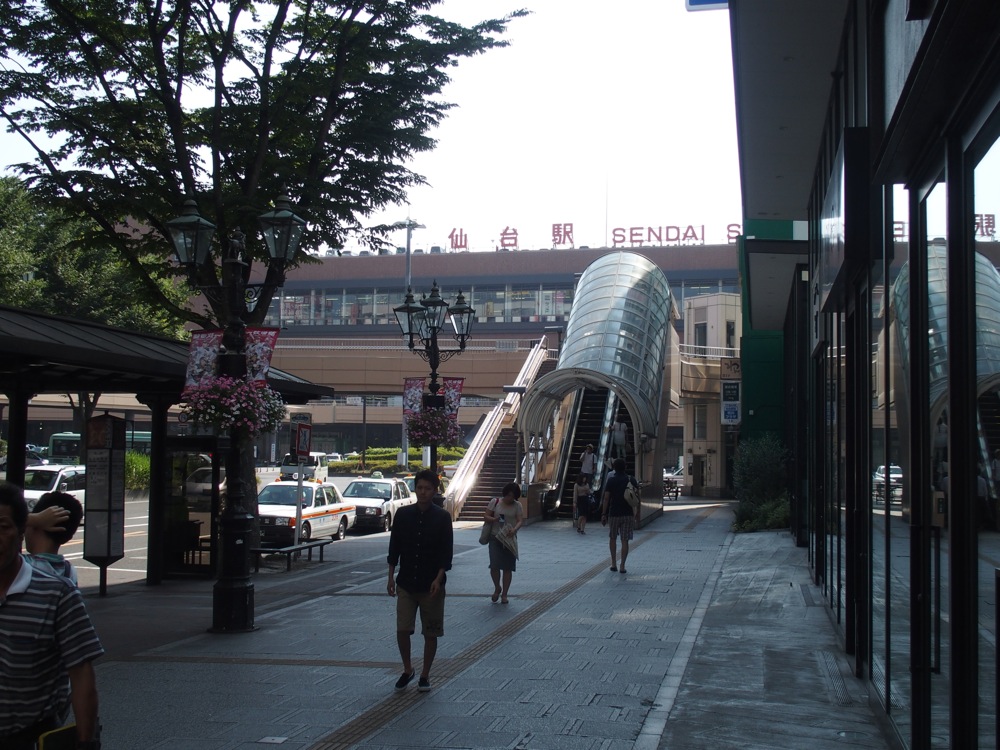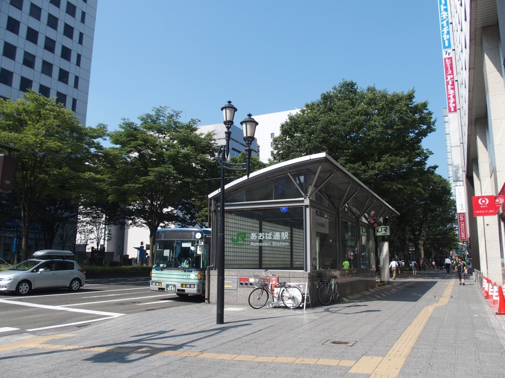 仙石線の起点駅は長らく仙台駅でしたが、前述のように2000年に仙台駅〜陸前原ノ町駅が地下化された時に、仙台駅〜あおば通駅間の0,5kmが開通し、起点はあおば通駅となりました。なので、この鉄道さんぽもあおば通駅から始める事になりますが、仙台駅から500mしか離れていない事もあり、事実、あおば通駅からも仙台駅の駅舎を望めます(笑)。それでも延伸されたというのは、それまでの仙台駅の位置が他の路線と比べて離れた位置にあった事も大きいと思います。特に、仙石線の仙台駅が、JR東北本線の仙台駅に比べて東側に位置するのに対し、仙台市地下鉄の仙台駅は西側にあったので距離がありました。そこで仙石線をそのまま西側に延伸する事によって、地下鉄の仙台駅とは、あおば通駅での乗り換えが便利になるようにしたのです。現在の利用者数は1日約2万人。この数字は、JR東日本の東北地区の駅では、仙台駅に次いで2位の利用者数です。