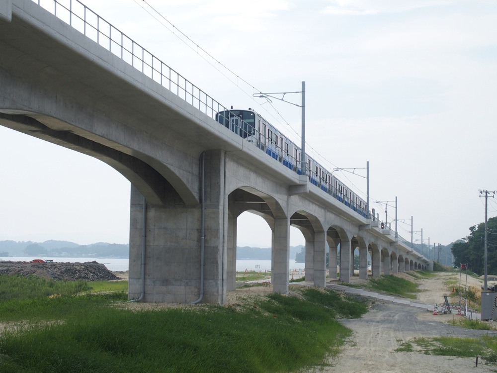 野蒜駅を出発すると左にカーブして、山を駆け下りていきつつも、そのまま新しく造られた高架橋へと入り、右側にはだだっ広い平野を眺めつつ、吉田川と鳴瀬川を真新しい橋梁で一気に駆け抜け、旧ルートに合流して(合流するポイント等は分かりませんでした…)陸前小野駅に到着します。ここから先は被害の少ないエリアに入る為、当駅から矢本駅までは2012年3月に、矢本駅から終点の石巻駅までは、2011年7月には営業運転が再開されていました。しかし、全面復旧するまでは架線の損傷や変電所が使えず、電車ではなく気動車での運行が行われたいたようです。