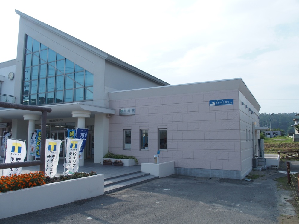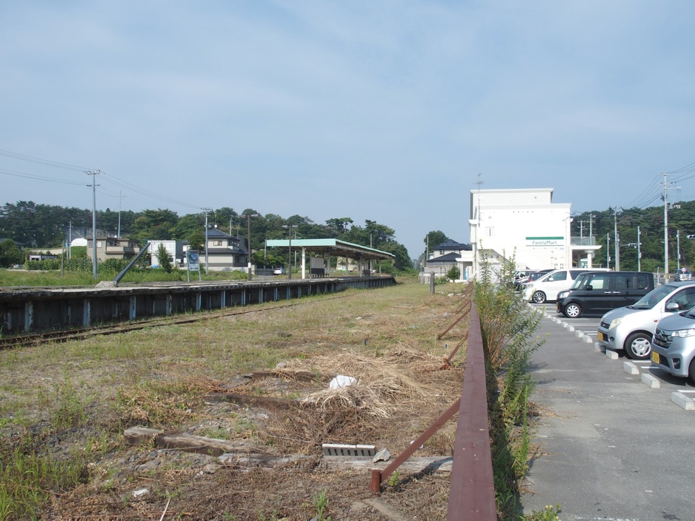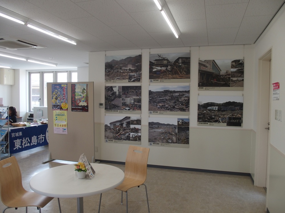 旧野蒜駅のホームから内陸側を見ると、かなり遠くの高台に列車が走っているのが目に入っていきました。これが新しいルートの野蒜駅で、旧市街からも結構離れてしまいましたが、これからは新しい駅周辺の開発が進むのでしょうか…。旧野蒜駅の周りも、以前は建物も沢山あったような記憶がしたのですが、今では数えるぐらいしか建物が残っていません。…とは言え、旧野蒜駅舎は改修され、観光交流拠点「野蒜地域交流センター」として生まれ変わりました。1階部分がファミリーマート、2階部分は多目的スペースとして、人を集める場所として今後注目されていく事でしょう。建物内には震災直後の様子が写真で掲示されており、先程通った東名駅の当時の様子も、リアルに目にする事が出来ました(右下写真参照)。