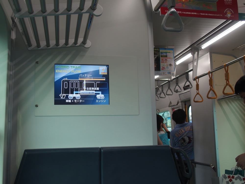 そして左からJR石巻線と合流し、終点の石巻駅となります。今回は途中に震災の爪痕が残る地域を通った事もあり、少々疲れてしまいましたが、最後に、この震災の余波を吹き飛ばす新型車両、仙石東北ライン用のディーゼルハイブリッド車両、HBーE210系について解説をしておきましょう。ディーゼルハイブリッド車両は、以前、JR小海線でも説明をしましたが〔鉄道さんぽ 5.(JR小海線編)参照〕、駆動に蓄電池、加速時にディーゼルエンジンを使用するという、電車と気動車の利点を併せ持った革新的な車両です。以前はまだまだ試験的な意味合いが強く、車両数も限られていましたが、仙石東北ライン用に登場したHBーE210系は、言わばこれからの仙石線の牽引役の車両でもあり、堂々とメイン街道をいく車両でもあります。これは技術力の向上を意味しており、頻繁に使われる列車に使用しても大丈夫という目処が立ったからだとも思います。今後の活躍を期待したいところです。