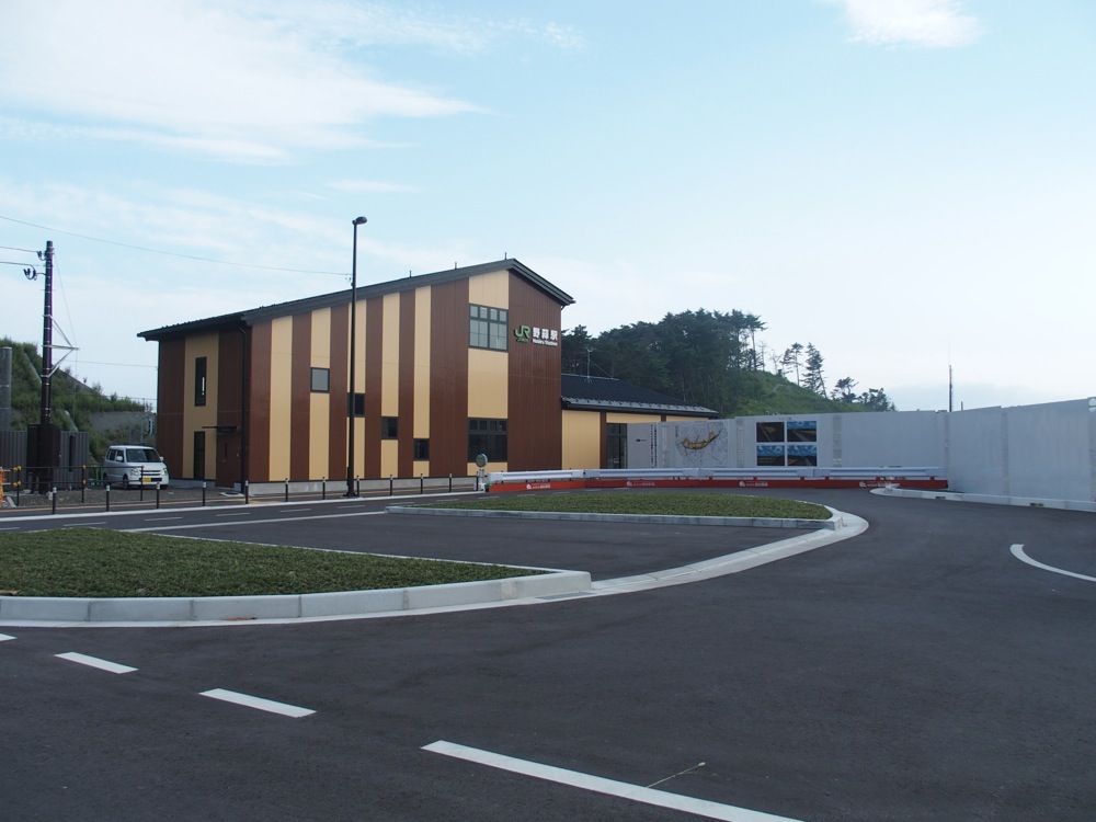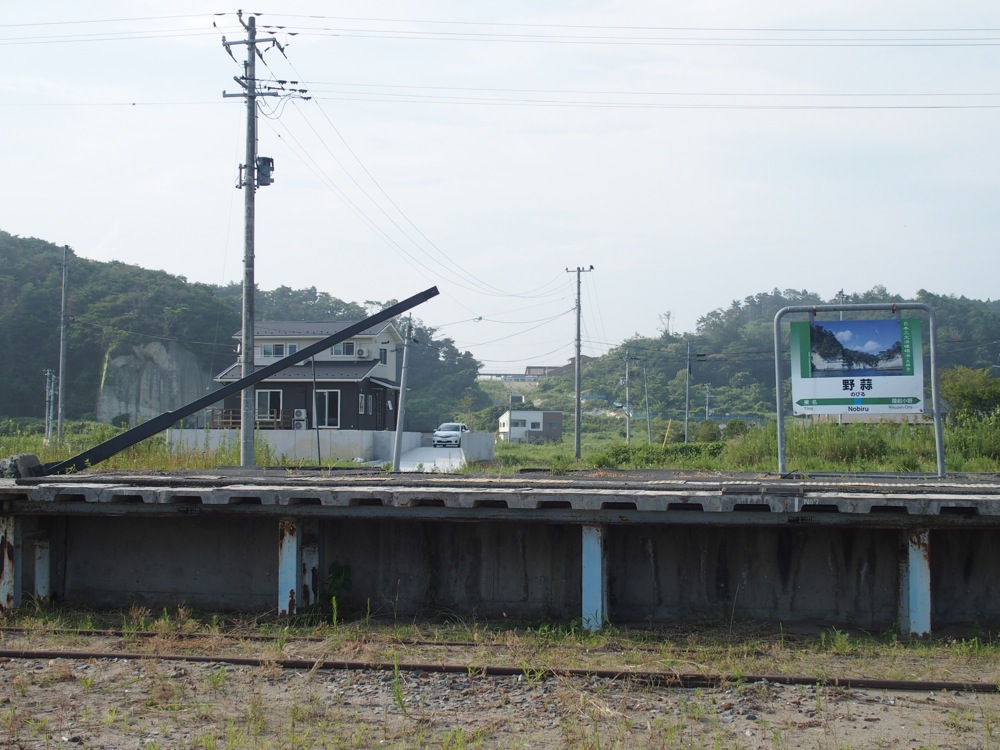 旧野蒜駅を後にし、高台に造られた新野蒜駅まで向かいます。直線距離にすると約500mの移設らしいですが、道は結構な大回りをし、しかも上り坂が続いているので、旧野蒜駅から徒歩で30分以上は掛かる道のりで、着いた頃には流石にヘトヘトでした。新野蒜駅のホームからは、先程とは逆に旧野蒜駅を見渡す事が出来ましたが、これからこの駅が野蒜地区とどう関わっていけるのか、注目していきたいと思います。
