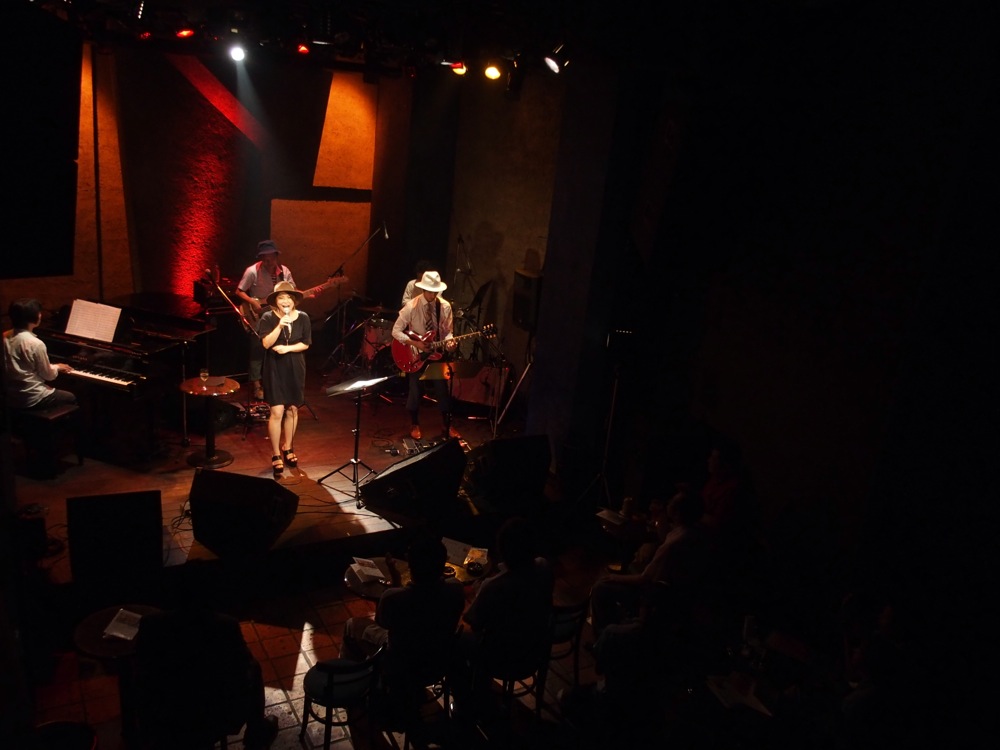 さて、自分達の出番がやってきました。これまで、何バンド目…という言い方こそしてきたものの、皆さん弾き語りの方達ばかりでしたので、バンドスタイルとなる自分達は今回でどちらかというと異色だったわけですが、彬子さん自身も既にワインの力も手伝って(笑)テンションも上がってきており、とにかく明るいライブにはなりそうでした。