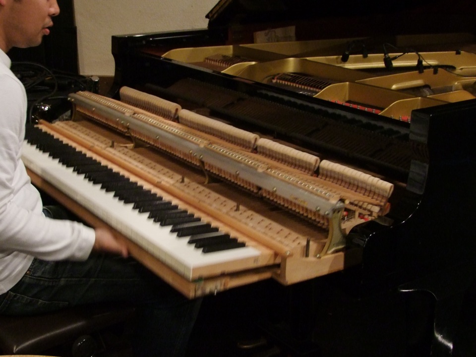 それよりも、グランドピアノの鍵盤が、実は左上写真のように、手前にスライド出来るというのが自分には驚きでしたが(笑)、実は調律仕立てのピアノというのは、自分にはあまり良い思い出がありませんでした。…というのは、もちろん家のピアノも調律をしているのですが、何故か最初の頃に違和感を感じてしまうのです。