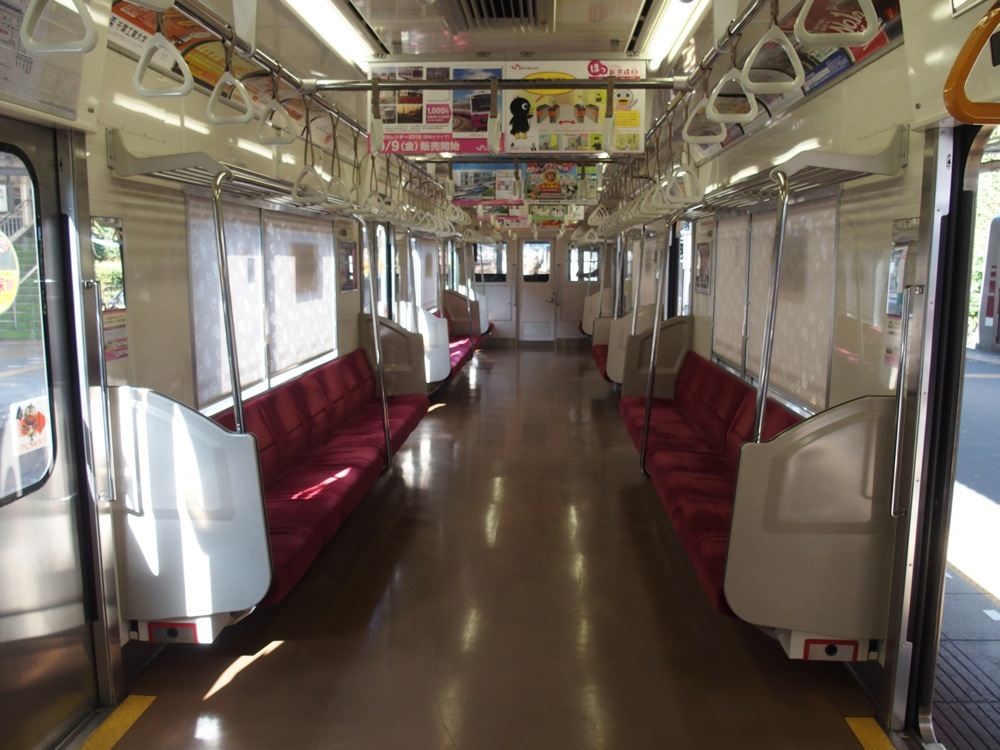 新京成の車内装備として特徴的なのが、ドア横に設けられた鏡です(上写真参照)。日本の他鉄道事業者では名古屋市営地下鉄や、相模鉄道(最近の車両は未装備)に見られる程度なので、結構珍しいと思います。前述のように、2014年に新コーポレートカラーが発表され、全車にその新塗装が施されるという事で、現在は旧塗装と新塗装車両が両方が見られるという過渡期の状況になっていますが(左下写真参照…両方ともN800形車両です)、鏡はしっかりと残っていますので(笑)、今後も新京成の特徴として生き続けていく事でしょう。