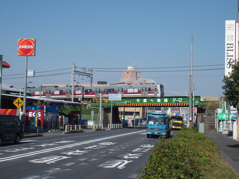 さて、松戸駅を出ると、常磐線と分かれて右に大きくカーブし、早速とばかり下総大地を登る勾配に差し掛かります。上り勾配は暫く続き、国道6号線を越えた先を頂点として、そのまま上本郷駅へと到着するのですが、この辺りは変化に富んだ所ですので、この区間を早速“さんぽ”してみましょう。勾配とカーブが連続するので、新京成電車の撮影地としても知られている区間でもあります。