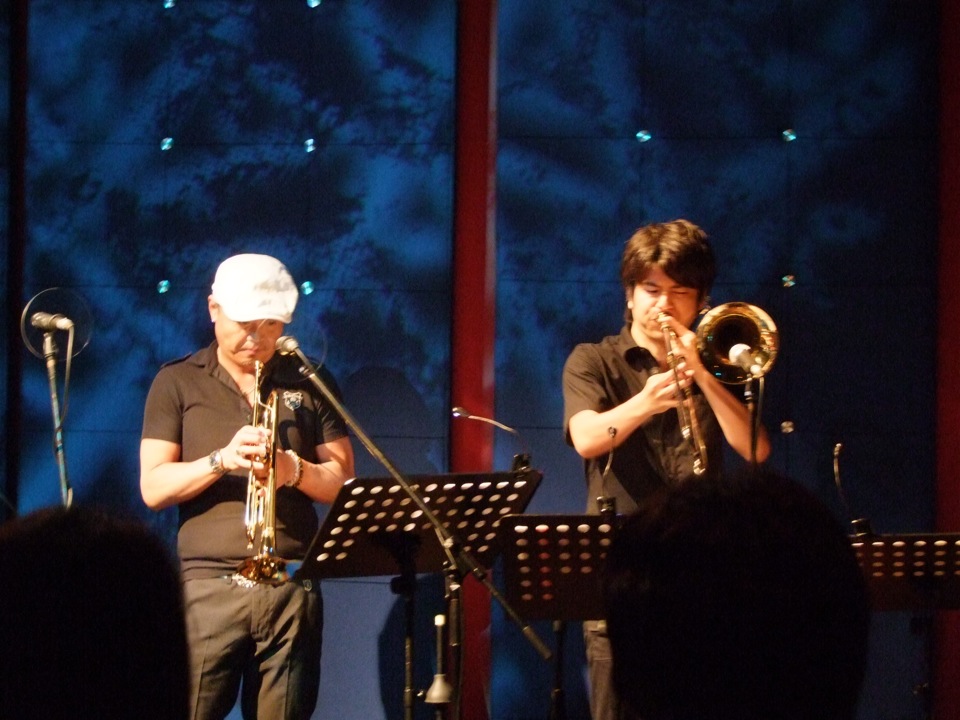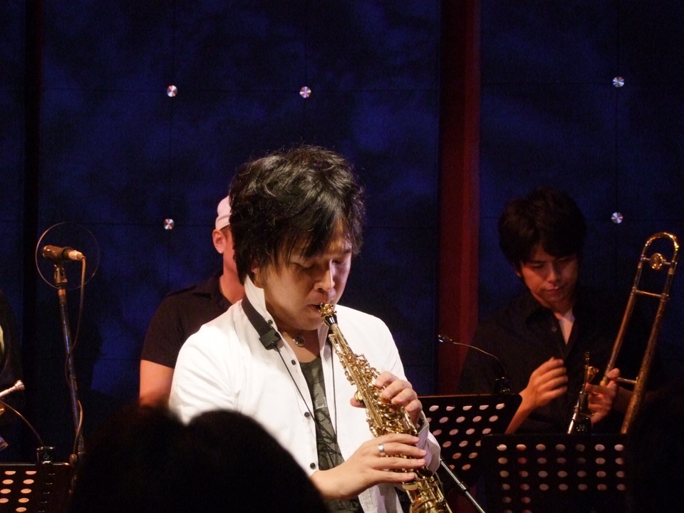 そして、お馴染みのナンバー“Tsugumi”、“Side By Side”へと繋げました。特に前者の曲は、それぞれのソロを思う存分楽しめる曲となっており、今回は飛び入り分も含めて、計5人のソロ(ベース⇒トランペット&トロンボーン⇒ソプラノ・サックス、アルト・サックス)を聴かせてくれました。これは流石に圧巻で、それぞれの楽器の可能性を、そして楽しみを限界まで見せてくれたというか(笑)、非常に面白い時間だったと思います♪…もちろん、アドリブというのは自然発生的にフレーズが生まれてくるので、この時の演奏は正に今でしか聴けないものだったわけです。こんな贅沢な時間もなかなか無い…そんな事を思わせたくれた時間でもありました。