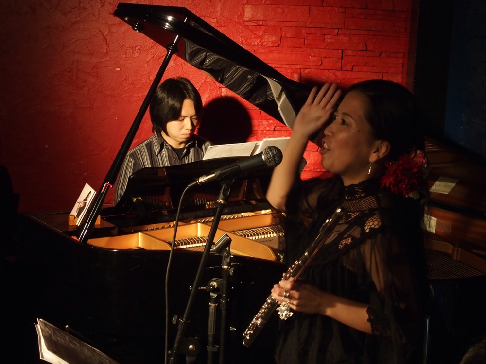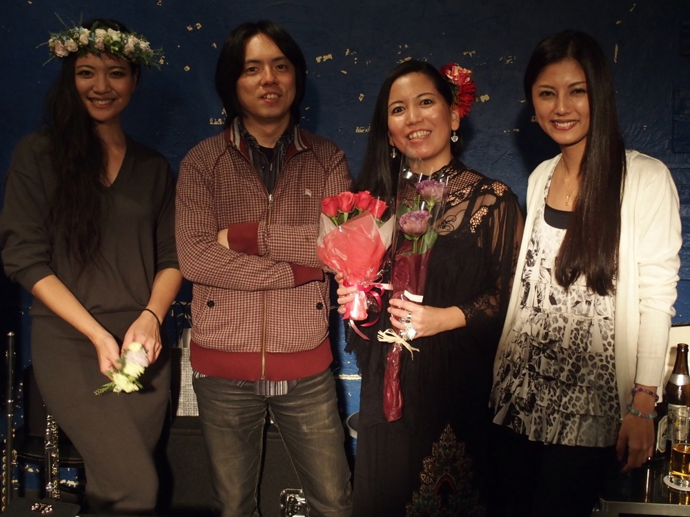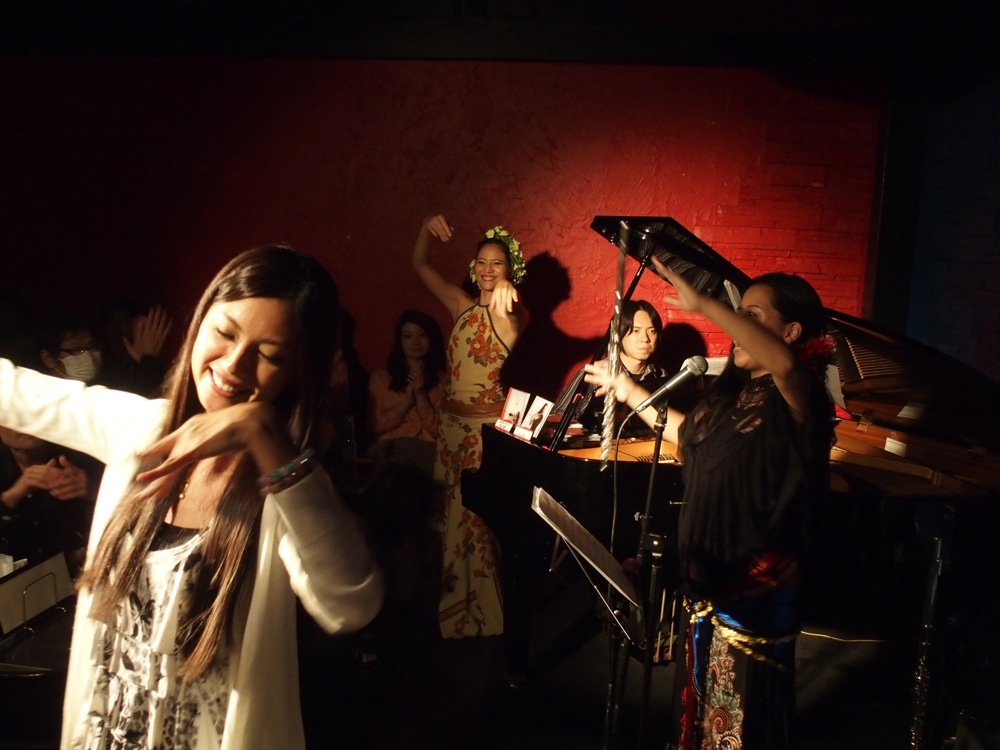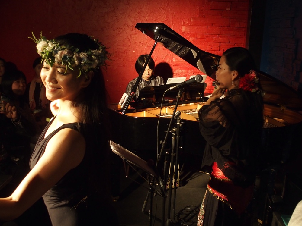 そして、もう1人は飛び入りゲストという形で、本当にライブ直前に決めたゲストだったのですが(笑)、やはり沖縄出身の、上間綾乃さんというボーカリストの方でした。…以前に麻衣子さんがイベントで上間さんと一緒になって、その時は初対面だったものの、この日のライブの事を伝えたらお越し頂けたという流れになり、そしてせっかくなら1曲歌って貰おうと何気無く考えたら、本当に1曲歌って貰える事になったのでした!…タレントとしても活動しており、既に2012年に日本コロンビアからメジャーデビューも果たしていますが、気軽にこちらの提案に乗って頂き、本当に有り難い限りでした。曲は古謝美佐子さんの“童神”。麻衣子さんもダンスで参加し、瑞々しいゆったりとした時間が流れていきました。