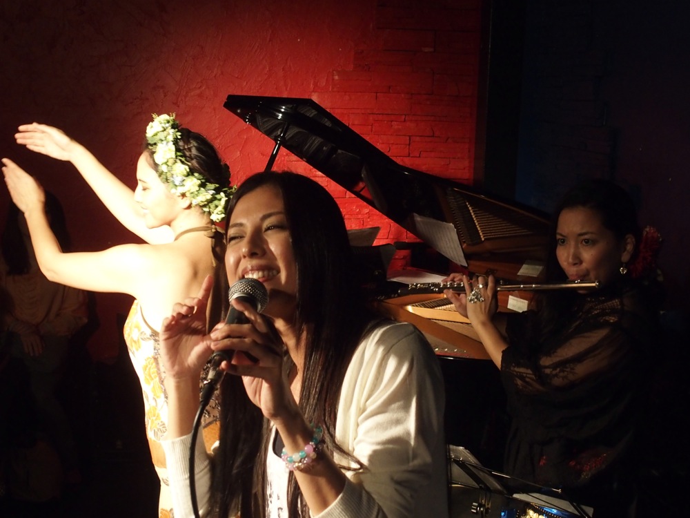 そしてこの日は、お2人のゲストの方に参加をして頂きました。まずは西仲さんと同じ沖縄出身の、フラダンサー石川麻衣子さん。麻衣子さんは2013年3月での西仲さんとの銀座わしたショップでのライブで最初に御一緒をし〔西仲美咲、東京ツアー(3.15〜3.16)参照〕、今回のCDトレイラーにも登場頂いています〔西仲美咲、3作目CDアルバム『LEQUIO HISTORIA』発売決定!参照〕。自分はそれ以来の共演となりましたが、今回は1ステージに付き1曲ずつ、フラダンスとライブのコラボとしてステージをお届けさせて頂きました。コラボ曲は1ステージ目は“月ぬ美しゃ”、2ステージ目では“夜間飛行”で、それぞれの曲で衣装を変えさていたのが印象的でした。