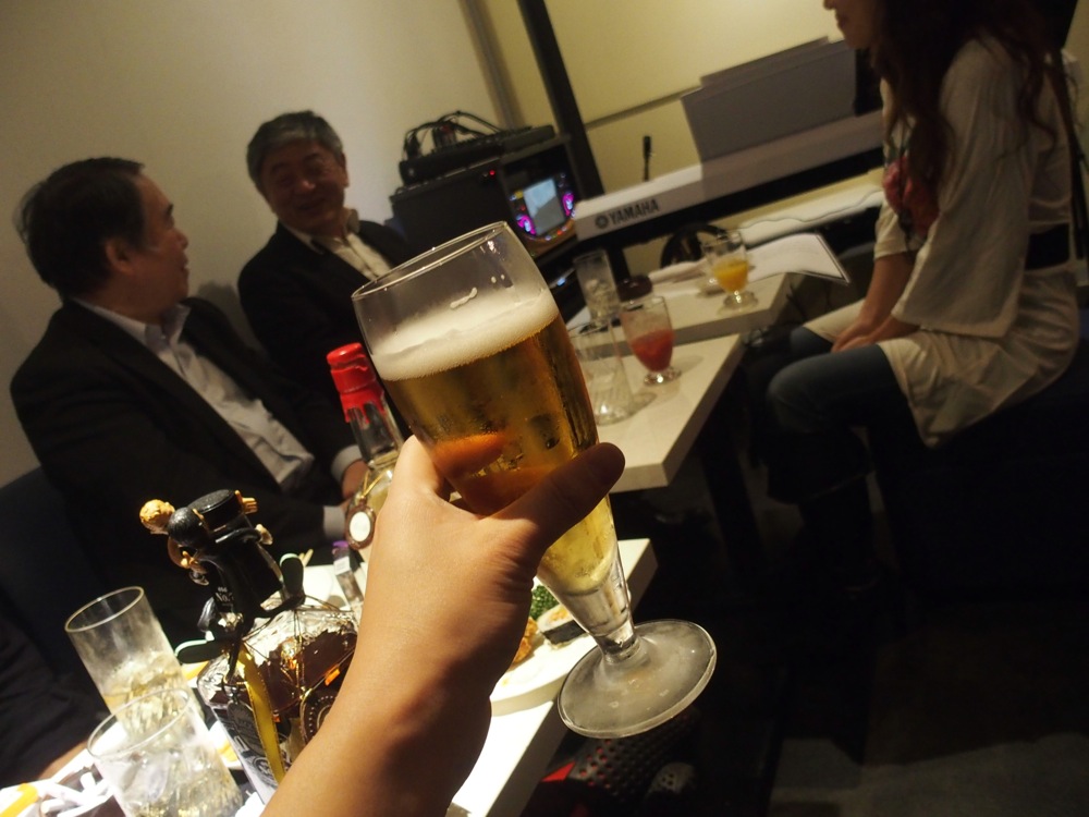 この日の演奏者は、ボーカルに白石恭子さん、そしてサックス&ボーカルに加地直子さんという面々でした。どちらも以前の Kuro からの共演者でもあり、またかつてのように楽しく一緒に演奏を出来る機会を与えられているというのは、本当に喜ばしい事でもあるように思います…。嬉しいので、お祝いにもってきた日本酒を自分でもたしなんでしまいました(右上写真参照)。曲によっては譲二さんの参加もあり、それこそ賑やかにお送りしていきました(その後、自分は通常のビールへと移ります…笑)。