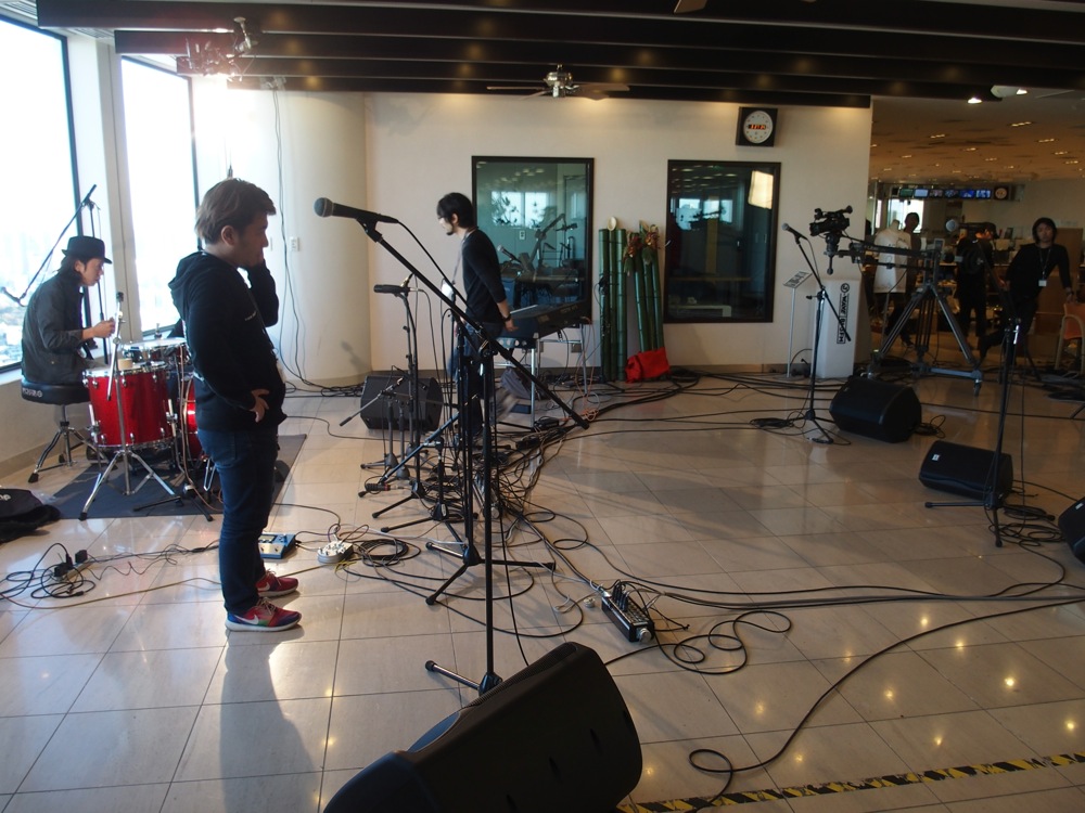 演奏場所が J-WAVE のロビー…と聞いた時、どういう状況で演奏するのだろうと思っていたのですが、なるほど、元旦なのでオフィス内は人が殆どいなく、だからこそ少し広めのこのロビーでステージを組めるのだと思いました。確かに普段の日ですと、ここで自分達の生演奏をお送りしていたら、オフィス内がうるさ過ぎて、仕事どころではなくなるかもしれません(笑)。