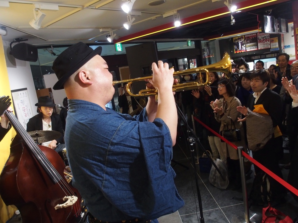 さて、本題のインストアライブですが、お店がグランドフロアに位置し、ステージも入口からすぐの所に設置されていたものも手伝って、ステージ前のフロアは既に多くのお客さんで埋め尽くされていました。そしてここなら、近くを通っただけで、寄ってみようかな?…という流れにもなるかもしれません。勿論、そんな方々にも自分達の存在を大きく知らしめすべく、最初からガンガンに飛ばして演奏していきました!