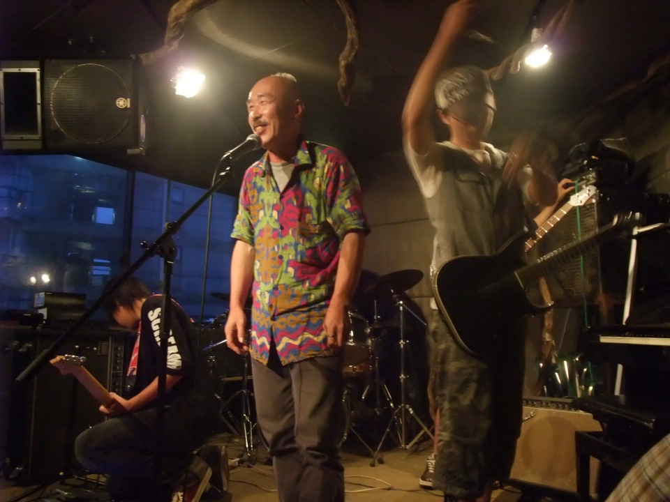 このバンド、La Miel(ラ・ミエル)と言い(フランス語でハチミツの意味ですな)、メンバー構成は上の写真通りな感じですが、若い高校生の息吹を感じさせた2曲(カバー曲ですが)を聴かせて頂きました。しかし、メンバーの中には、まだ楽器を初めて3ヶ月くらいしか経っていない人もいるらしく、それにしては随分とまとまりがあったと思いましたね。もちろん、それぞれのパートで一杯一杯の様子ではあり、もっとバンドらしくすべき部分は、言えば沢山出てきてしまいますが、まずは1ステージやり切った!…というのが、何より素晴らしかった事ではないでしょうか。そして、ミキヤが予想以上に大人らしくなっていて、何だか感心してしまいました。まあ、ミキヤはこういった場所に昔から出入りしているので(笑)、慣れている部分もあるとは思うのですが、そういった今までの活動が、今回正に生かされていた感じですね。このバンドが終わった後の、伊藤さんの安堵の顔(左下写真参照)といったらありませんでした(笑)。また出演してほしいものですね。