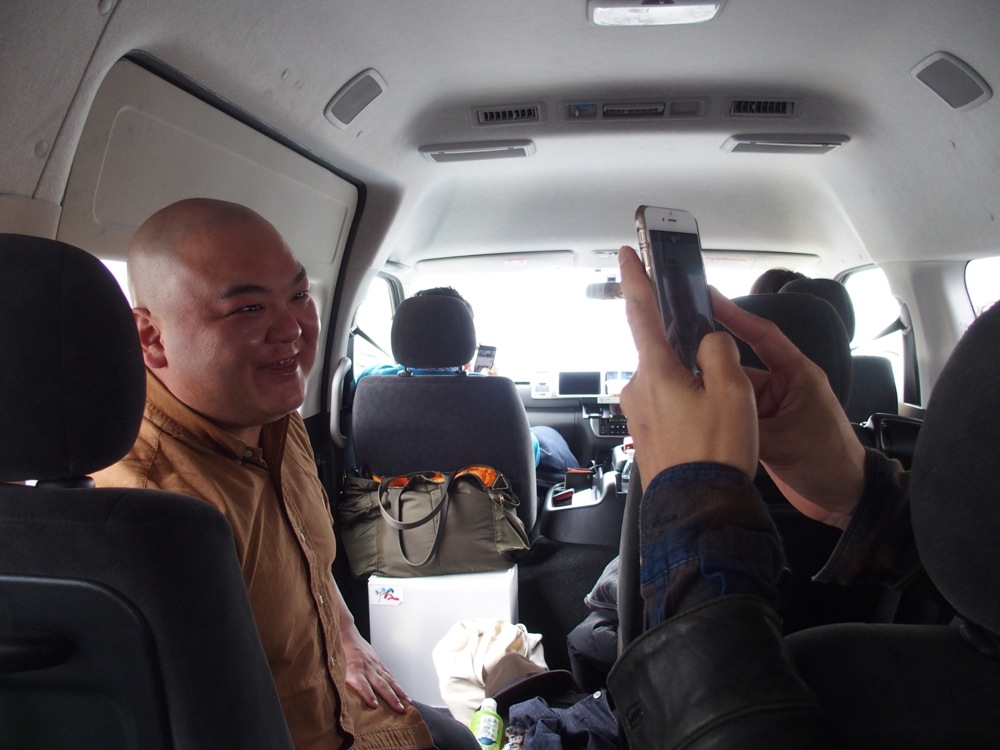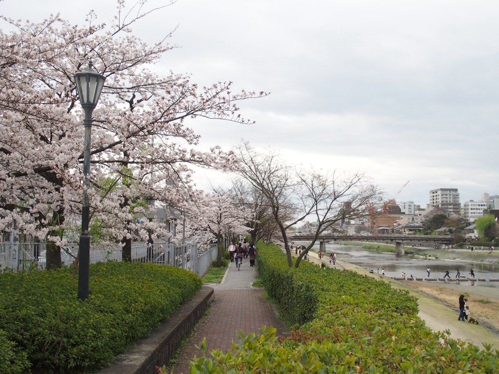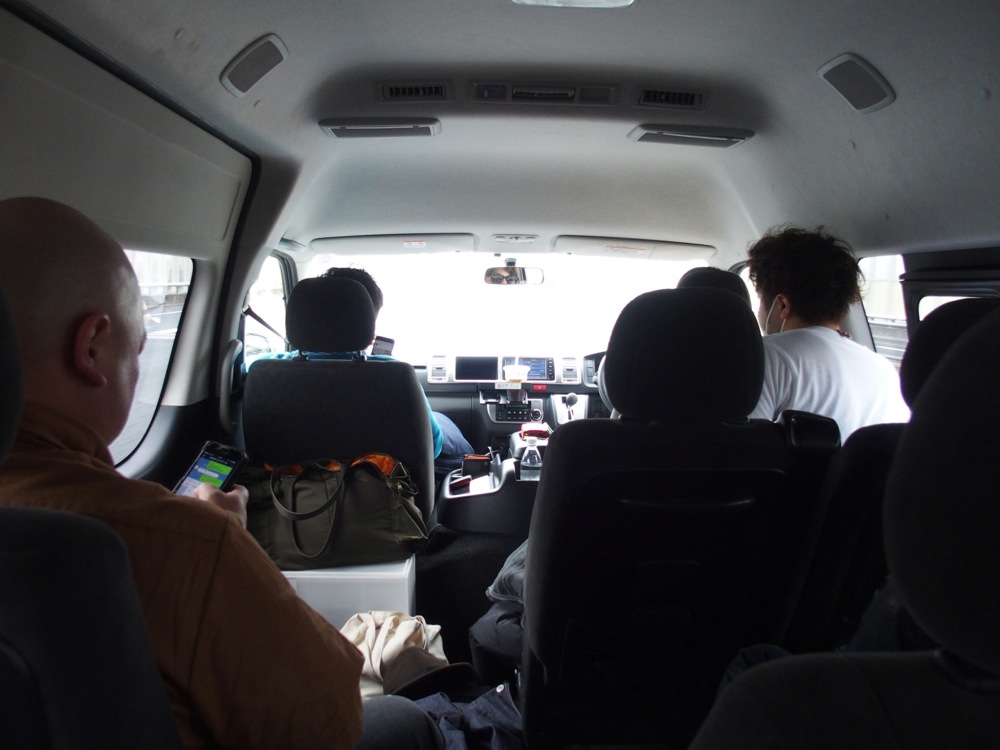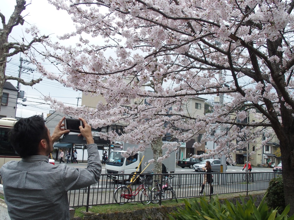 東京からは、fox capture plan のメンバーと、Playwright スタッフと共に、大きなワゴン車で移動。雨の降りしきる中、朝7:30という早さでの出発となりましたが、順調過ぎる程に京都にはお昼過ぎに到着出来ました。雨も止んでいて、ちょうど京都は桜が満開の時期。お昼ご飯を食べがてら、ゆっくりとその桜を見る事が出来ました。