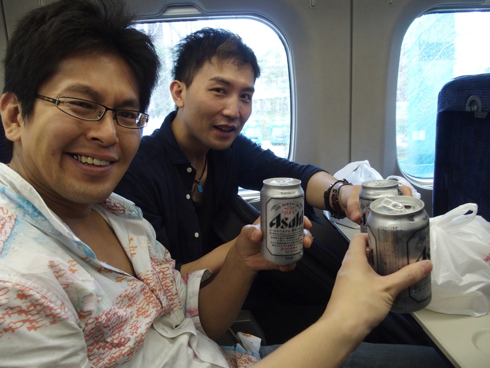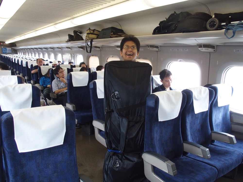 車内では既に祝杯が行われ(笑)、楽しい感じが伝わってくると思いますが、メンバーそれぞれの荷物は多く、自分もキーボードを持っての移動だったので(左下写真参照)、その大変さの反動のものなのかもしれません(笑)。これらはインストアライブ用に用意したものでもありましたが、周平さんはパーカッションのセットもあるので、この3人だけでも、荷物の量はかなりのものになってしまいます。新幹線座席は広めに設定してあるのでまだ良いのですが、それ以外の移動がこれまた大変です。車内では出来るだけ楽しんで移動しておきたいものなのでした。