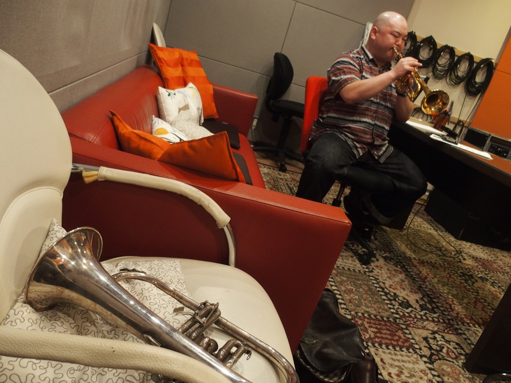 勢いを追求するあまり、トランペットやサックスは通常ブースに入っているのですが、ある時から出てきて(右上写真参照)ドラムと同じ部屋で録るようになりました。敢えて音を被らせていく事により、ライブ感ならではの勢いのあるサウンドを作り出していくのです(その分、演奏者への負担は大きいものになりますが…)。
