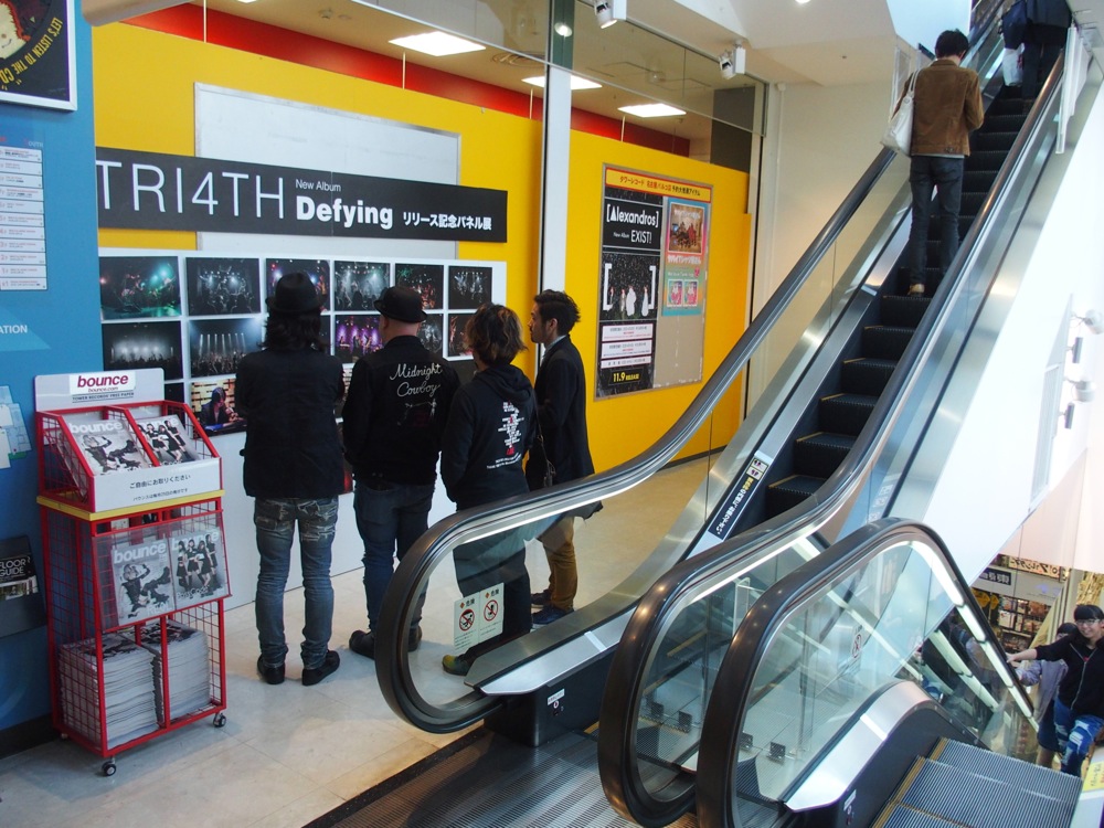 そして2日目となった名古屋は、池下にある UPSET というお店で、やはりスタンディングのワンマンライブをやらせて頂きました。勿論、タワーレコードにも寄らせて頂きましたが、こちらの名古屋パルコ店ではCD『Defying』のリリースに合わせ、なんと TRI4TH の写真パネル展が開催されているという事で、そちらも見てきたい思いが強かったです。本来は9月までの展示でしたが、展示期間を10月末まで延ばしてくれていて、自分達もやっと目にする事が出来たのでした。これらはメンバーのサインを付けて、お客さんにプレゼントする形になります。多くの方にお届け出来ればと思います。