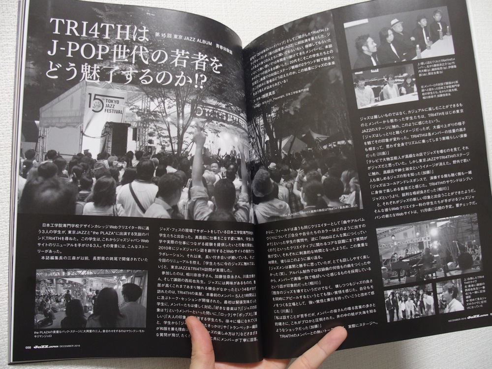 対談のお相手は、日本工学院専門学校の学生達3名…。JaZZ JAPAN の創刊時から、本誌の web サイト制作の方でコラボレーションをしているとの事で、学生達に今のジャズに触れてほしいという企画で、自分達との対談が実現したのでした。皆、ジャズには興味はあるようですが、ジャズの印象を聞くと、「難しそう」、「大人っぽい」という感じで、話していくうちにジャズはもっと気軽に、カジュアルに楽しんでも良いもの…というような流れになっていきました。