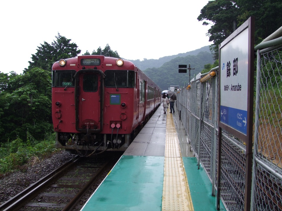 今回の目的の余部は、そんな区間に位置します。非電化でディーゼルカーなので速度も遅く、実際線路も急勾配、カーブが多くなってくるので、列車は思うようにスピードを上げられないままです。しかし自分からしてみれば、正にこれこそが山陰本線の醍醐味だ!…と思ってしまうもので(笑)、なかなか不思議ですよね。実にのんびりとした動きで1つ1つ駅を停車していき、城崎温泉駅を出て約50分、例の余部橋梁を渡って、列車はついに餘部駅に到着しました。