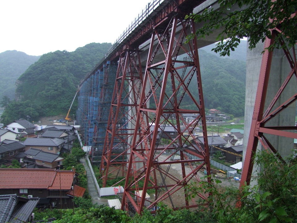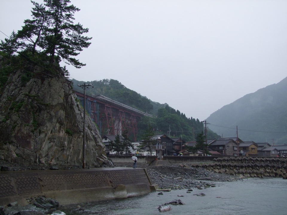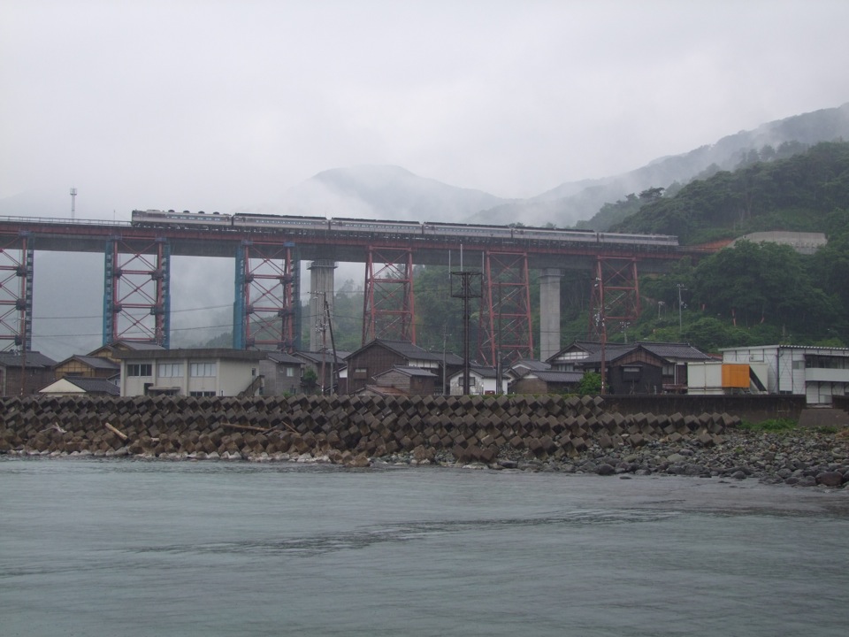 旅日記『ニューヨーク編』かと思いきや、6月に敢行してきた鉄道旅行について少々綴らせて頂きます(笑)。今回の目的はズバリ、山陰本線の余部橋梁と、そこを走る特急『はまかぜ』号です。現在(2010年8月12日以降…)、この橋梁は新しく付け替えられているのですが、今年の7月16日まで使われていた橋梁は1912年に完成したものなので、それこそ100年近く使われていたという事になります。全長約319m、高さ約40m、そして11基の橋脚、23連の橋桁を持っており、その独特な構造と鮮やかな朱色、そして周りの風景とも相まって、全国有数の鉄道風景名所としても知られてました。それは鉄道ファンどころか、山陰地方を訪れる観光客にも人気のある場所で、自分も一度は訪れたいと思っていたものなのです(通過した事はありますが、降りた事はありませんでした)。