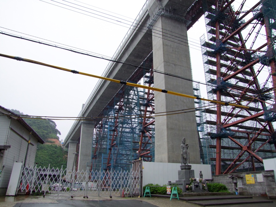 そして、やっとの思いで橋桁の下に出る事ができましたが、なんと雄大な橋梁なのでしょう。正に、見上げる…という言葉が必要な程、その橋梁の全体を把握するには時間を要しそうです。この橋が無ければ、普通の喉かな海のある街…という感じなのでしょうが、余部橋梁のお陰で、多大なるインパクトに溢れています。そして、その橋梁を通る列車と相まって、とても情緒深い景色が作り出せているなと思いました。確かに、鉄道文化遺産とはよく言ったものです。