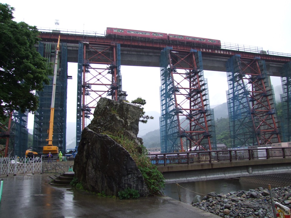新しい橋梁というのは、まだ一部繋がっていない部分があったものの、もう殆ど出来ていると言って良いような状態で、旧橋梁も、いよいよ付け替えか…という事実が、ここに来て改めて理解できたような気がしました。新しい方は現代的であり、コンクリート使用で、非常に頑丈そうな感じです。しかし旧橋梁にも、それに劣らず魅力的な部分があるというのは、ここに来た自分だけの意見でも無さそうですね。自分の他にも、橋梁に向けてカメラを向けている方がチラホラいたのが、何よりの証拠です。また、国道の通り道でもあるので、どこからか車でやってきて、走行中の列車を撮って、また別の場所に移動する…といった方も結構多かったように思います。確かに、未だ止まない雨(むしろ本降り…泣)という天気でしたから、そちらの方が便利と言えば便利なのでしょうが…、しかし、やはりここは鉄道で訪れたい場所なような気がします…。