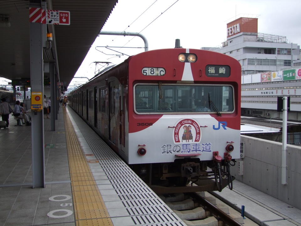 この区間を走る特急列車は、実に様々です。…と言うのも、この先、色々と路線が枝分かれしていくのが原因で、行き先によって列車名を変えている為です。実際、この時に乗った列車も、特急『まいづる』・『たんば』1号となっていて、途中の綾部駅で一部車両を切り離し、二手に分かれて発車していくという二層立ての列車でした。具体的には東舞鶴駅行きが『まいづる』、福知山駅行きが『たんば』、天橋立駅行きが『はしだて』、城崎温泉駅行きが『きのさき』…となっています。そして途中の福知山駅では大阪方面からの福知山線特急(こちらは、天橋立駅行きが『文殊』、城崎温泉行きが『北近畿』です)も流れ込み、また、観光特急的な存在として、車両も異なる『タンゴ・ディスカバリー』号というのもありまして、ある種、特急列車名の入り乱れ状態ともなっています(笑)。要するに、京都から来た列車と、大阪から来た列車が福知山駅で合流し、それが、天橋立と城崎温泉方面に分かれていくわけです。言わば、福知山駅が合流駅の役割を果たしているわけですね。そして、これらの特急列車は、上手い具合に福知山駅で同じホーム、同じ時間帯で乗り換えられるようにしていて、例え乗り換えが発生しても、特急券は通し料金で購入できるのです。それぞれの列車が組み合わさって、計1時間に1本程度の特急の本数ではありますが、効率の良いネットワークが組まれていると言って良いと思います。そんな自分は福知山駅で乗り換えて、城崎温泉駅へと足を進ませました。