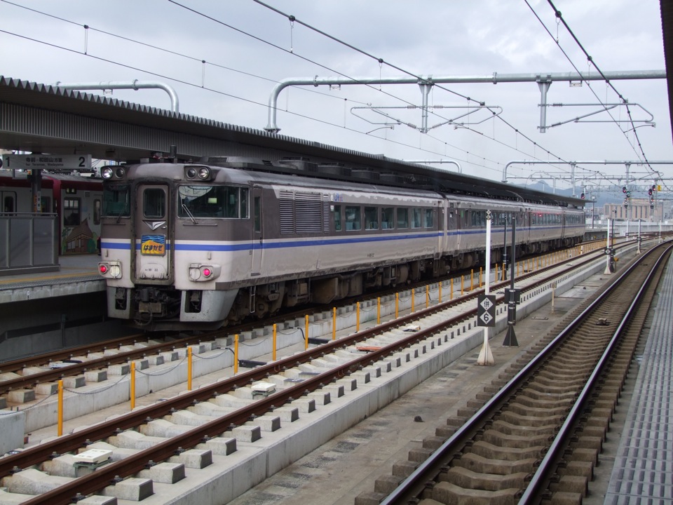 和田山駅を出てから約1時間、車窓右手に姫路城が見えてくると、播但線の終点姫路駅に到着となります。鈍行列車で乗り継いでも1時間半あれば着く距離なので、そんなに『はまかぜ』号は速くは走っていないのでしょうが、良い旅でした…。列車はこのまま大阪駅まで走りますが、今回はここで見送るとしましょう。もう自分は、東京に戻らなくてはなりません。高架化された姫路駅との対比が、若干アンバランスな気もしましたが、これも時代の流れなのでしょうか…。そんな背景には似合わない、騒がしいエンジン音を立てて、『はまかぜ』号はゆっくりと大阪駅に向け、発車していきました。