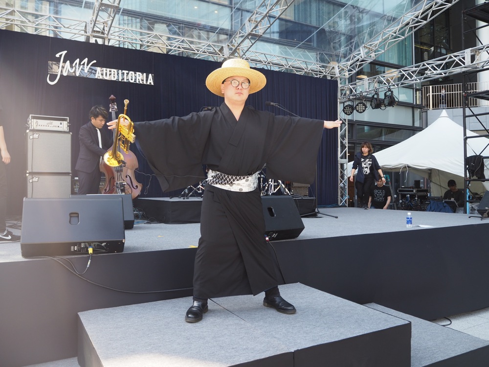 当日は好天に恵まれました。神田淡路町の新しい複合施設“ワテラス(WATERRAS)”内の広場にステージは造られ、緑の多い場所も相まってか、近代的なビル群の中に現れた都会のオアシスのような雰囲気がそこにはありました。ステージの前には沢山のベンチシートが揃えられていましたが、ここは午前中に配布される整理券が必要な席らしく、あとは基本的には周りでの立ち見になるそうです。