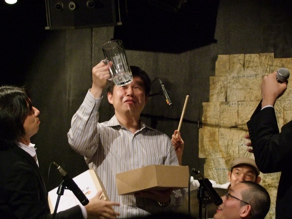 …白状しますが、今回のライブをやるにあたって、自分は最初は都合が付かずで、参加できない方向になっていました。しかし、色々とバンド側がライブの日程や、リハーサルの日程までを考慮してくれたという結果、何とか出演出来る運びになりました。そして、このライブ当日は、彼にステージ上で送別品を渡す大役まで請け負う事に(急遽)なりまして、これは参加の甲斐があったというものでした。…遠くドイツでは研究に籠るようですが、このバンドが呼べるくらい有名な人になって貰いたいものです(笑)。