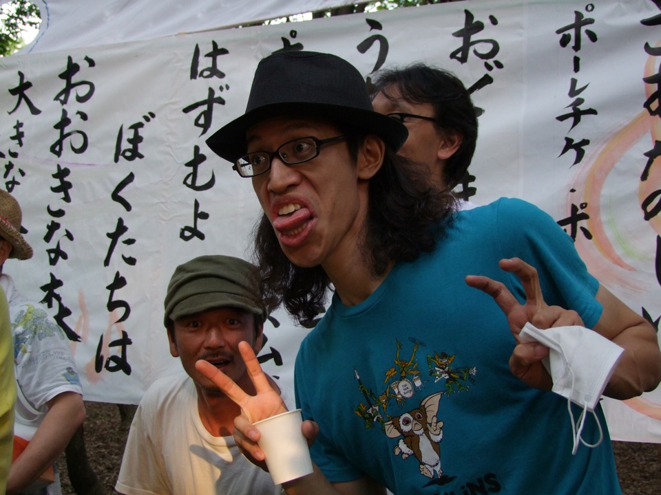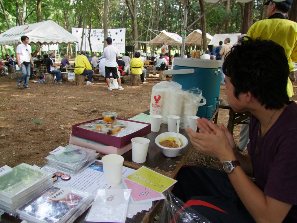 この日は、自分達を含めて計10組のミュージシャンが出演していましたが、Daddy 津田さんや水野たかしさん等、お馴染みの方達が勢揃いといった感じで、流石、さばいばるいとうさんの企画のライブだ!と思ってしまいますね(笑)。その他にも、今年の7月に修善寺で演奏した時〔“Folk Song Festival 伊豆”に参加 参照〕にお世話になった、修善寺 Cafe de Schile(かふぇ・ど・しーれ)のマスター、Donya さんや、8月中のツアーで、山口での演奏時にお世話になった李陽雨(イ・ヤンウ)さん等も出演しているようで、今まで伊藤さんと回ってきた土地土地で出会った方々が、今日、一同に介している…という雰囲気で溢れ返っていました。これぞ伊藤さんの人徳ですよね。確かに、人と人との縁で深く成り立っているイベントであるという事が、改めて感じられました。