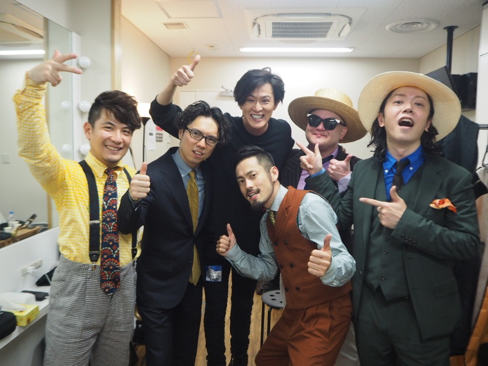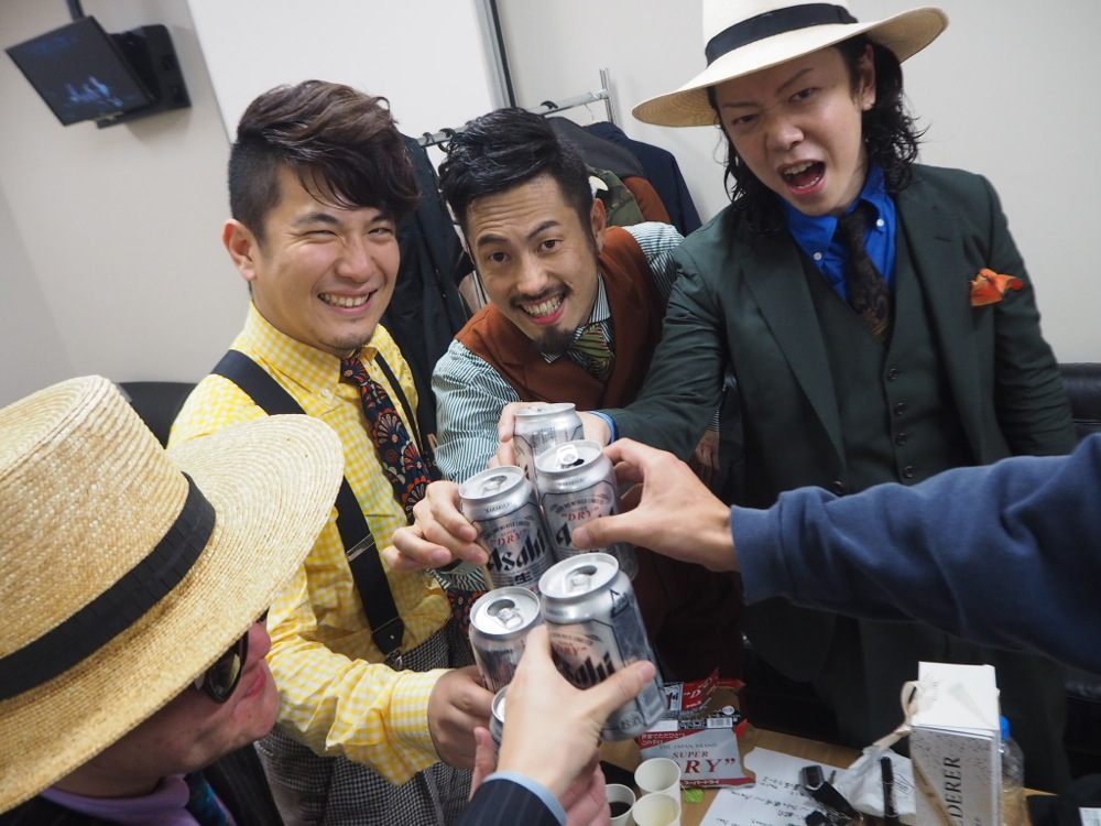 上写真は、無事にステージを終え、楽屋での風景になります。俳優の新納慎也さんにもお越し頂きました。こうして、色々な方に見て貰えるというのも、本当に励みになるのです。そして、勿論ライブ直後には皆でビールで乾杯をしました。これがまた美味しかったです。