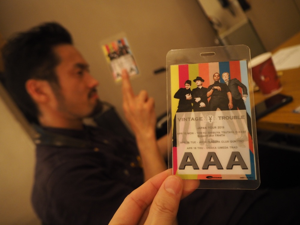 VINTAGE TROUBLE の日本ツアーは、ここ東京と、名古屋、大阪の計3ヶ所。もっと多くても良いくらいの素晴らしいバンドですが、サポートアクトが存在するのもここ東京だけで、本当に自分達は良い機会を頂いたと思ったものでした。ステージパスも格好良く、しかも「TRI4TH」の文字を入れて貰っているのも嬉しいです。VINTAGE TROUBLE のリハーサルも間近で見せて頂きつつ、本番への気持ちをより高い部分へと上げていきました。