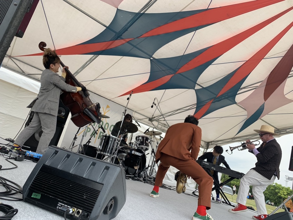 自分達に与えられたステージ時間は35分。野外という事もあり、開放感のある TRI4TH らしい楽曲達で攻めていきたいものです。ファミリー層も多く、ジャズをあまり聴かない方達にも分かりやすいような手法でステージを展開させていきました。自分達のステージは勢いがあると定評がありますが(笑)、このような場所では勢いだけではなく、ジャズの楽しさ、ライブの楽しさ等も混ぜてお送りしていくように務めていきました。