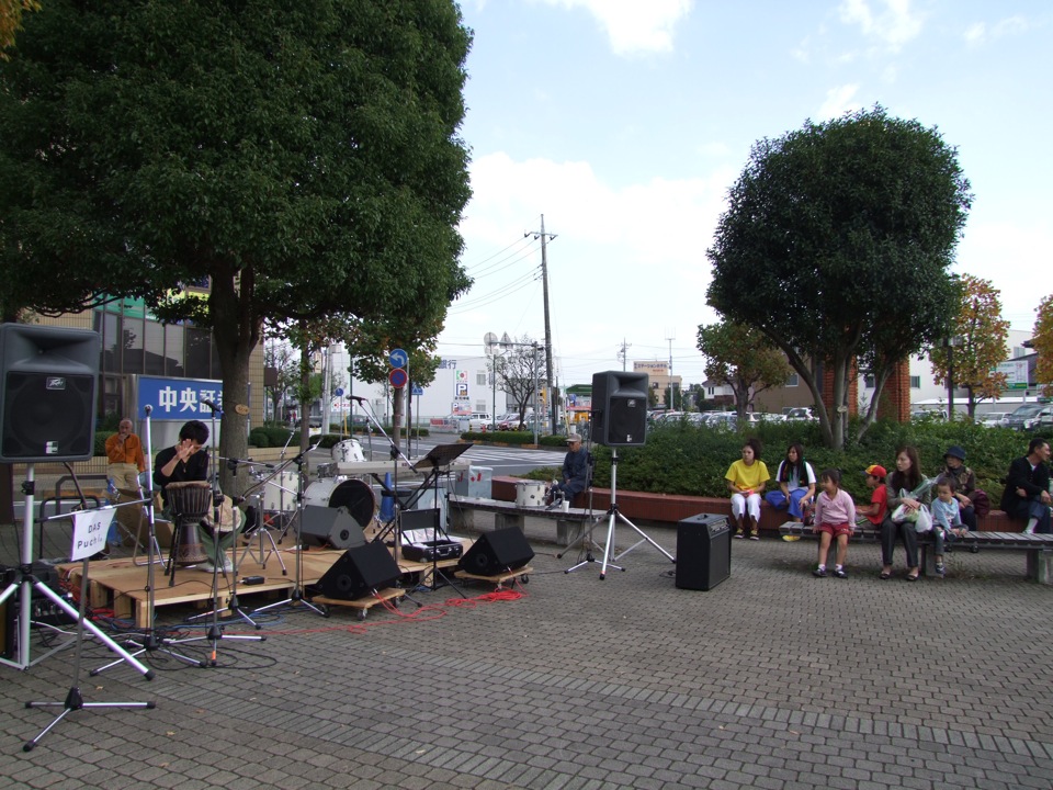 場所は、本当に牛久駅の目の前という感じです。要は、駅前のロータリーの中に会場を用意している状況だったのに、正にタイトル通りの場所という事ですね。ステージの他に、色々な屋台も並んでおり、小規模ながら、和気藹々としている雰囲気が印象的でした。出演する人というのも、自分達のようなライブ的なものだけではなく、ダンサーもいたり、大道芸の人もいたりと、なかなかバラエティにも富んでいて、多角的な戦略を感じさせてくれたものです。
