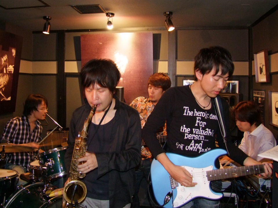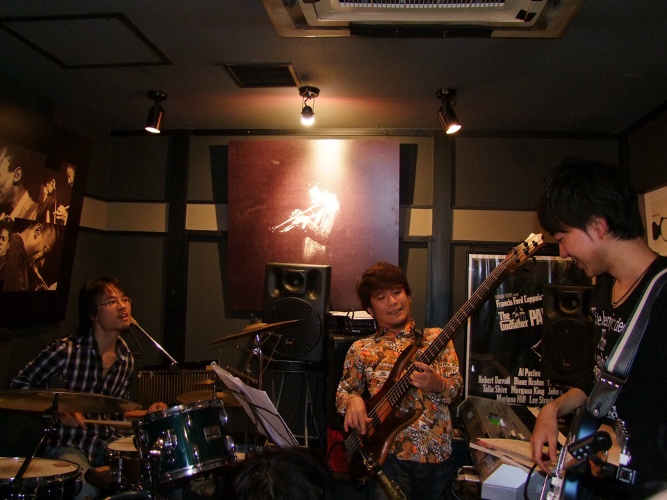 勿論、ステージの狭さも一級品です(笑)。キーボードのスタンドの左足はギター・アンプですし、右足は店に建て付けてある固定椅子+雑誌で高さ調整(笑)…です。そして、自分のすぐ目の前をベースのネックが右往左往し、そのベース位置の譜面台の上には、ドラムのシンバルが覆い被さるようにセッティングされています。…というか、こうでもしないと人が全員入りきらないのです。正にすし詰め状態と言うに相応しく、ここで展開される激しいライブは、それこそ空気が足りなくなる程なのです。
