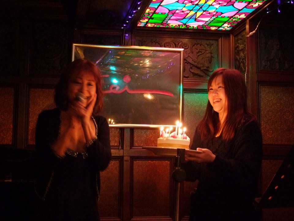 この日のライブ日、2月13日というのは、バレンタイン・イブでもありますが、実は Mirano さんの誕生日でもありました。Mirano さん自身としては、特に何か考えていたわけではなかったようですが、そこはサプライズで、娘さんやお店のスタッフ等で用意したバースデー・ケーキがライブ中に持ち込まれたりして、また華やかな時間が生まれたものでした。…こういった形での親子共演(右上写真参照)…、なかなか良いのではないかと思います。