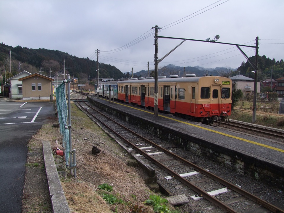 ここで、次の下り列車を待ちます。久留里線は、日中は概ね1~2時間に1本の運転なので、先程東清川駅で列車を見送って以来、まだ次の列車が来ていないのです。一応、横田駅は駅舎があって、建物の中で列車を待つ事が出来るのですが、そこには特にドア的なものがあるわけではなかったので、室内ですら相当寒かったです…。ここで待つ事約15分…。自分以外には1人の学生っぽい乗客を乗せ、更に列車は奥へと進み始めました。